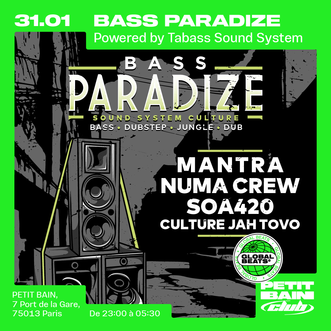 Bass Paradize débarque au Petit Bain ce 31 janvier pour une nuit célébrant la Sound System Culture dans toute sa diversité. Une seule salle pour explorer tout le spectre de la Bass Music : du Dubstep à la Jungle en passant par le Dub et les rythmes hybrides. Le tout sera propulsé physiquement par le Tabass Sound System, installé au cœur du club pour une immersion totale. Préparez-vous à vibrer !