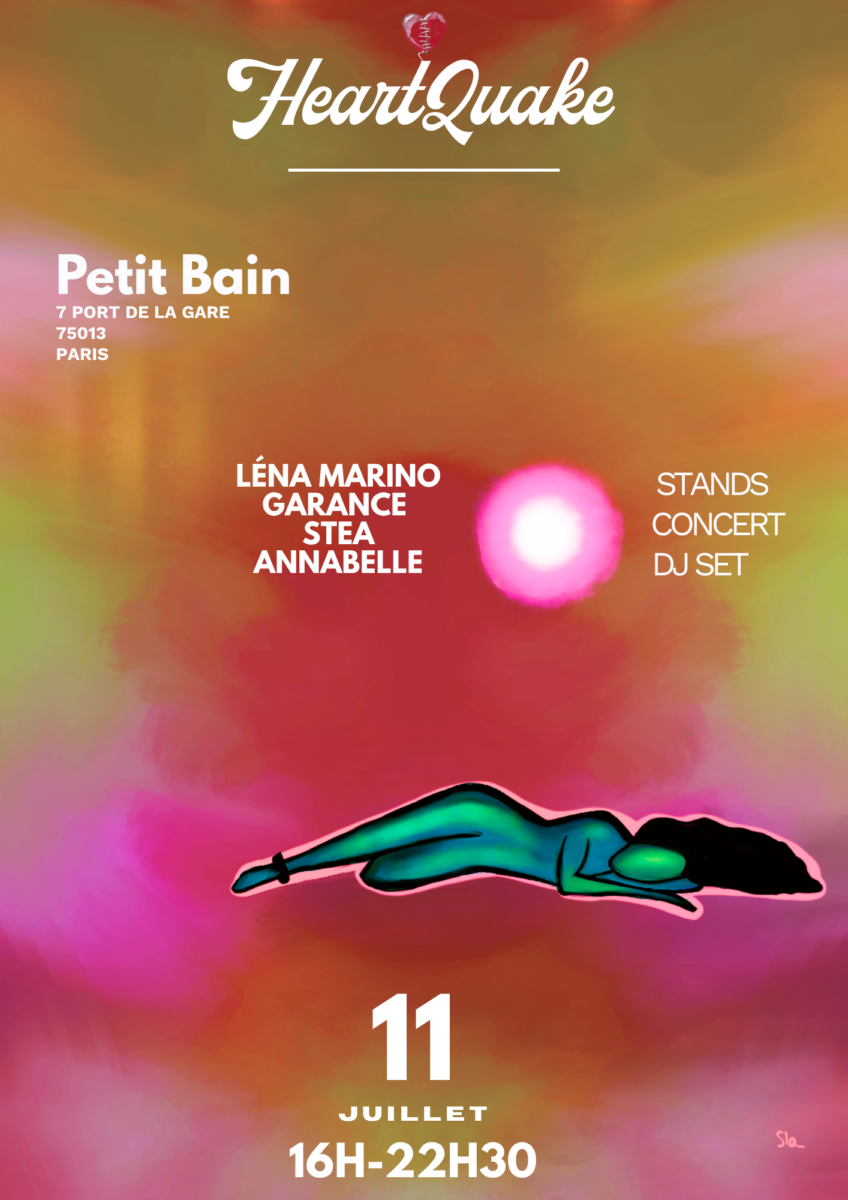 La Heartquake est une soirée pensée pour toutes celles et ceux qui ont déjà eu le coeur brisé. Elle se veut la promesse de délivrer le temps d’une soirée un espace de rencontres, d’activités, de lives musicaux permettant à chacunes et chacun de recoller les morceaux de leur coeur brisé. La vocation de cet évènement est de co-construire deux dynamiques fusionnelles : à savoir dans un premier temps, un espace de rencontre et d’échanges pour le public grâce à la création de stands, d’activités, d’espaces de discussions. Le tout en étant rejoint dans un second temps par une partie concert suivie d’un dj set.